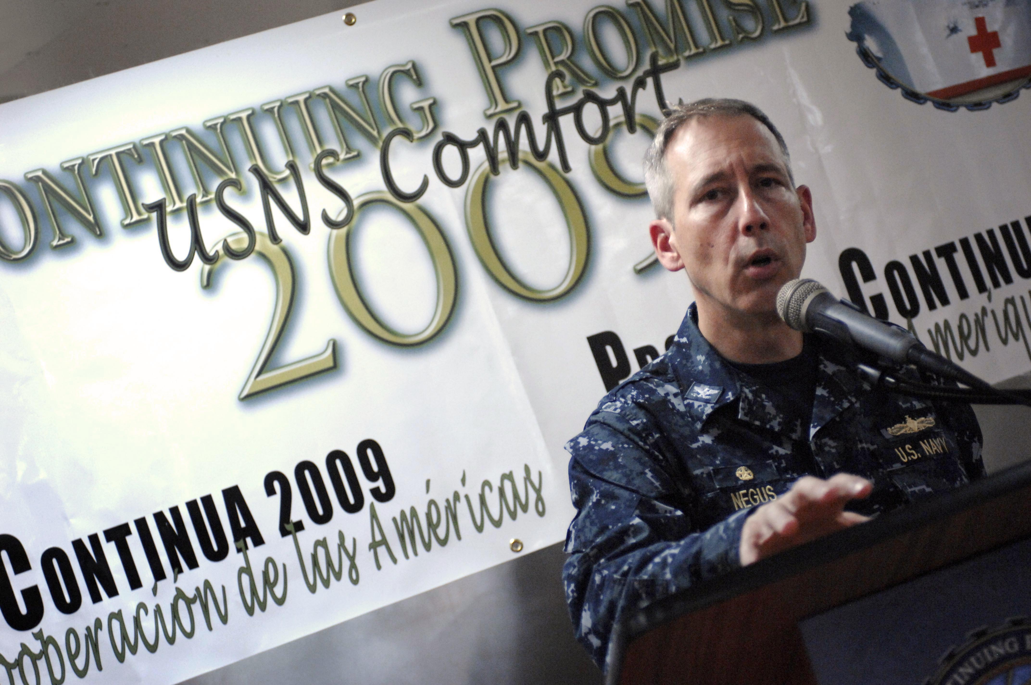 Navy Capt. Tom Negus, mission commander for the USNS Comfort Continuing Promise 2009, talks about the mission to local reporters during a stop in Nicaragua, July 10, 2009. DoD photo by Fred W. Baker III Navy Capt. Tom Negus, mission commander for the USNS Comfort Continuing Promise 2009, talks about the mission to local reporters during a stop in Nicaragua, July 10, 2009. DoD photo by Fred W. Baker III SHARE: Download: Full Size (0.95 MB) Credit: VIRIN: 871104-A-XGX36-304.jpg Photo Gallery