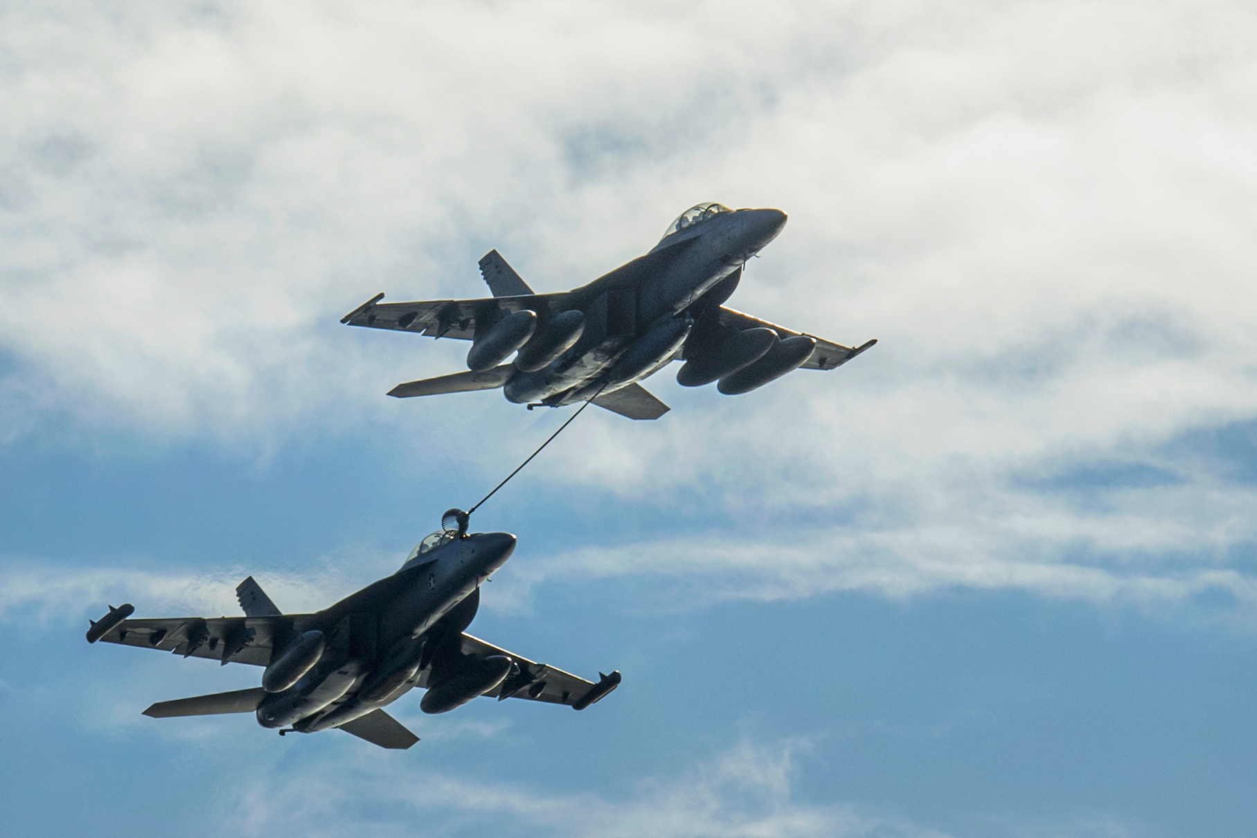 A F/A-18F Super Hornet assigned to Strike Fighter Squadron conducts an aerial refueling of an EA-18G Growler assigned to the Electronic Attack Squadron 139 during an air-power demonstration above aircraft carrier USS Carl Vinson in the Pacific Ocean, May 30, 2015. A F/A-18F Super Hornet assigned to Strike Fighter Squadron conducts an aerial refueling of an EA-18G Growler assigned to the Electronic Attack Squadron 139 during an air-power demonstration above aircraft carrier USS Carl Vinson in the Pacific Ocean, May 30, 2015. SHARE: Download: Full Size (1.23 MB) Tags: photo essays Credit: VIRIN: 414166-W-LVI02-270.jpg Photo Gallery