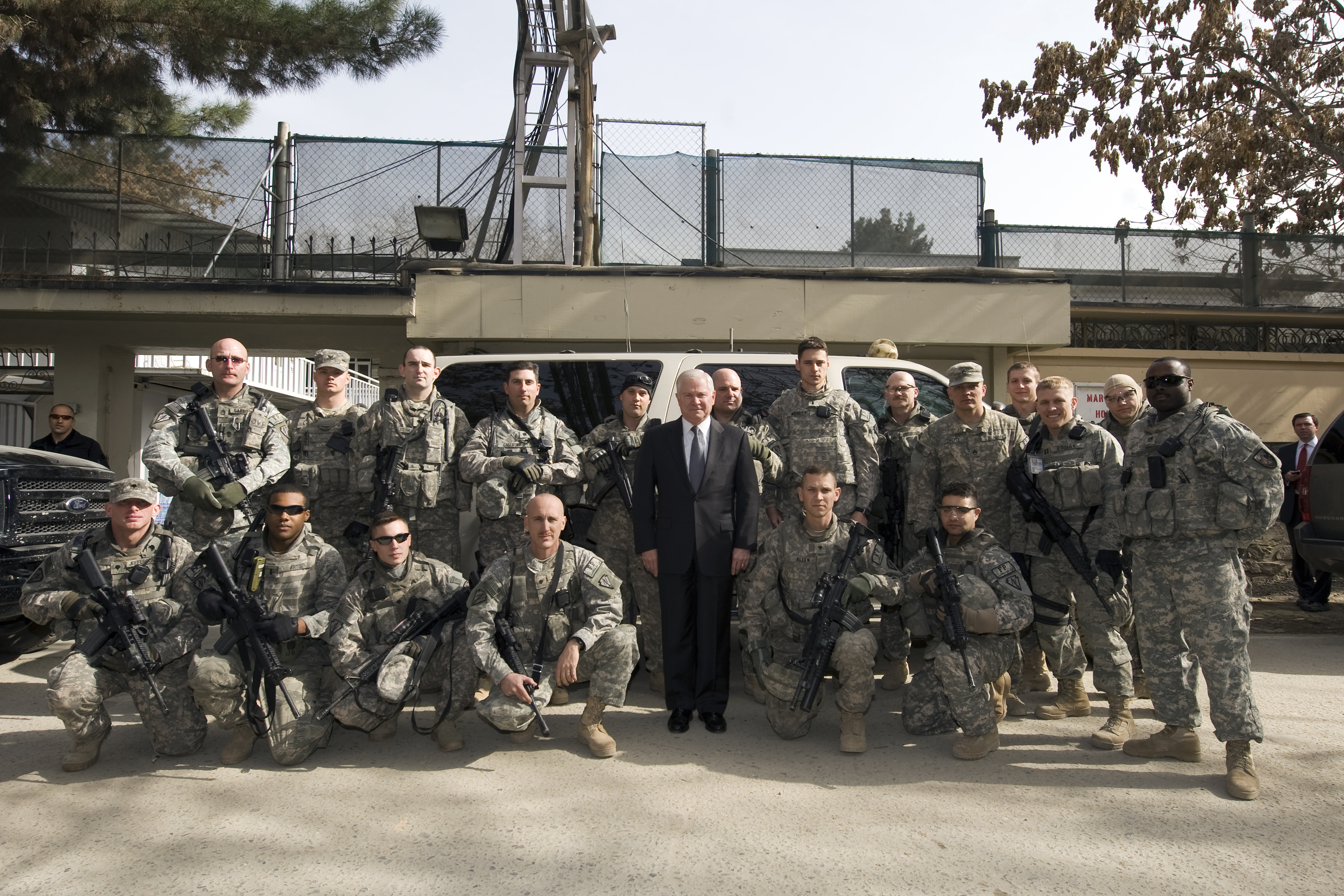 U.S. Defense Secretary Robert M. Gates poses for a photo with U.S. troops on Camp Eggers, Kabul, March 10, 2010. U.S. Defense Secretary Robert M. Gates poses for a photo with U.S. troops on Camp Eggers, Kabul, March 10, 2010. SHARE: Download: Full Size (4.92 MB) Tags: photo essays Credit: VIRIN: 694551-L-OWW37-564.jpg Photo Gallery