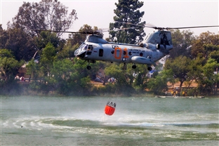 FIRE AID A U.S. Marine Corps CH-46 Sea Knight helicopter lifts off after filling a Bambi bucket to help fight fires and contain the Cocos fire in San Marcos, Calif., May 16, 2014. SHARE: Download: Full Size (0.07 MB) Credit: VIRIN: 154434-F-ESM61-727.jpg Photo Gallery