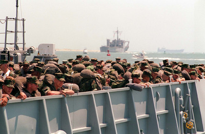 U.S. Marines from Bravo Company wait aboard a U.S. Navy Landing Craft Utility. U.S. Marines from Bravo Company, Battalion Landing Team 1/8 wait aboard a U.S. Navy Landing Craft Utility that will transport them to the USS Nassau (LHA 4) from Radio Island near Morehead City, N.C., on May 4, 1996, for Combined Joint Task Exercise 96. More than 53,000 military service members from the United States and the United Kingdom are participating in Combined Joint Task Force Exercise 96 on military installations in the Southeastern United States and in waters along the Eastern seaboard. SHARE: Download: Full Size (0.05 MB) Credit: VIRIN: 452971-V-KFA02-775.jpg Photo Gallery