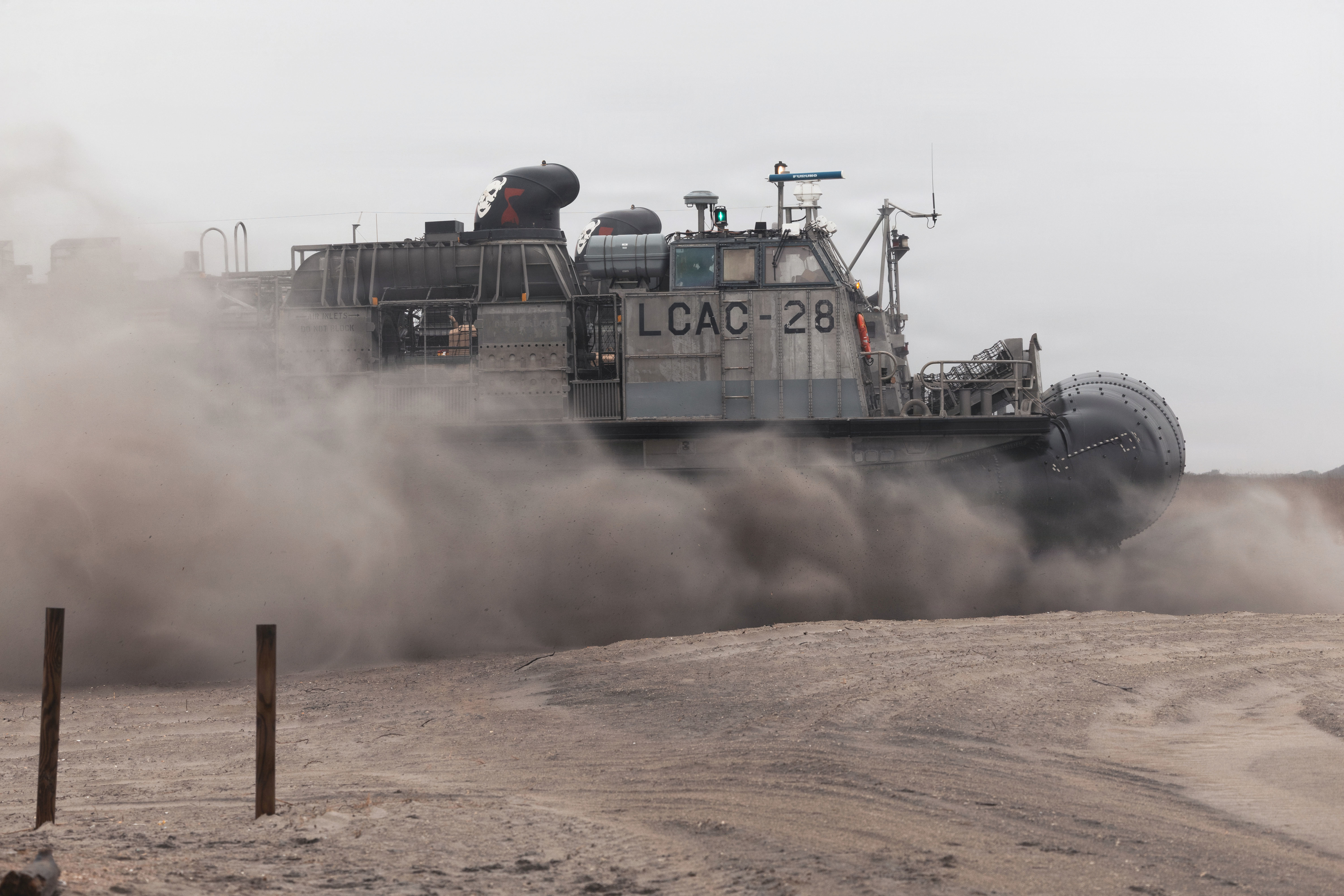 A Navy air-cushioned landing craft participates in Type Commander's Amphibious Training 26.1 at Marine Corps Base Camp Lejeune, N.C., Feb. 27, 2026. The training was designed to enhance mobility and integration between the Marine Corps and the Navy.