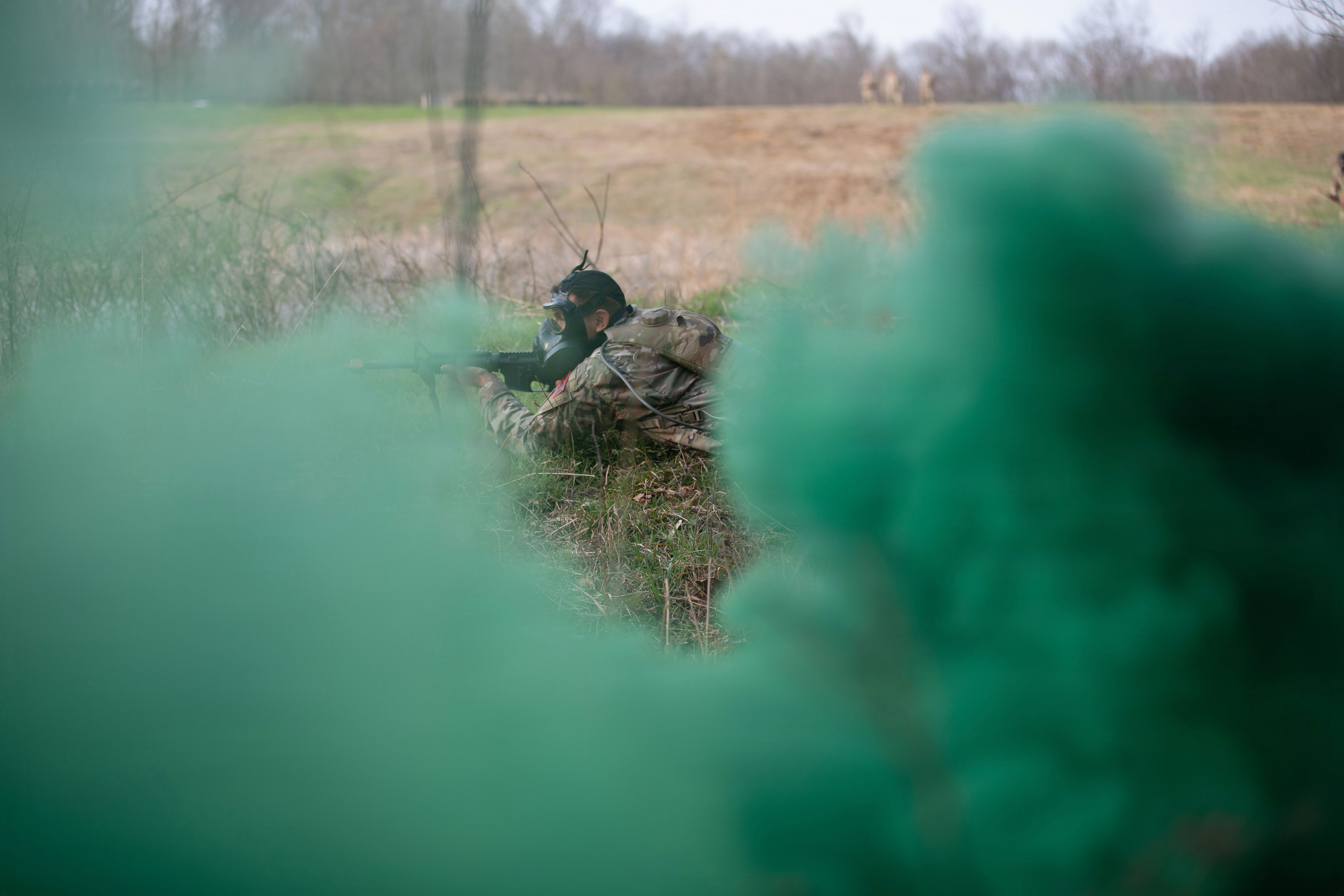 Army Staff Sgt. Donald Zarate reacts to a simulated chemical attack during the Combined Best Squad Competition at Fort Knox, Ky., March 26, 2026. The event required competitors to properly retrieve, don and seal their protective masks within a 90-second standard.