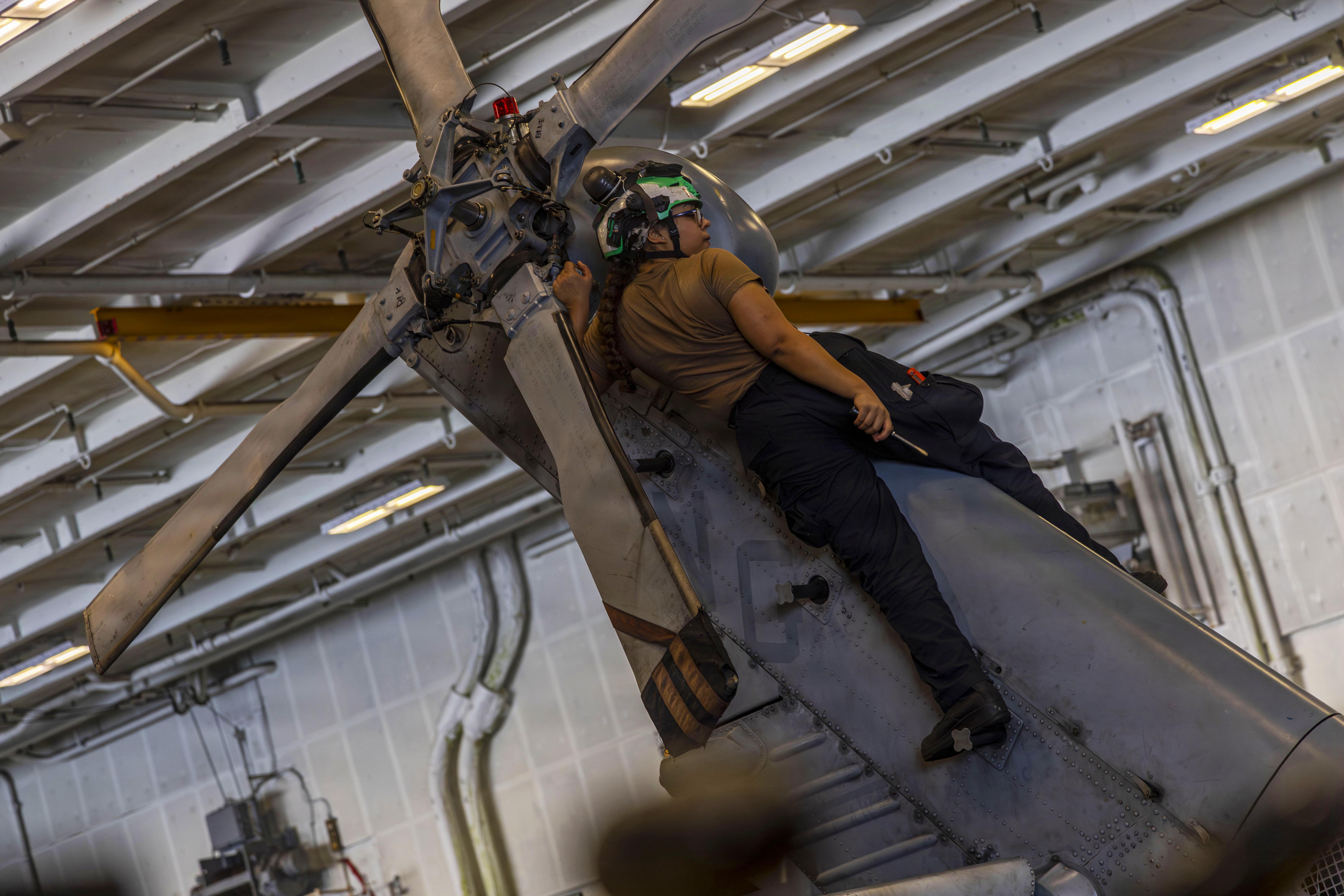 Sea Hawk Repair Navy Seaman Apprentice Genisis Revilla, an aviation machinist's mate, conducts maintenance on an MH-60R Sea Hawk helicopter, assigned to Helicopter Maritime Strike Squadron 71, in the hangar bay of the aircraft carrier USS Abraham Lincoln in the Arabian Sea, Feb. 2, 2026. SHARE: Download: Full Size (1.27 MB) Tags: navy Credit: Navy Seaman Daniel Kimmelman VIRIN: 260202-N-NH911-1098.JPG Photo Gallery